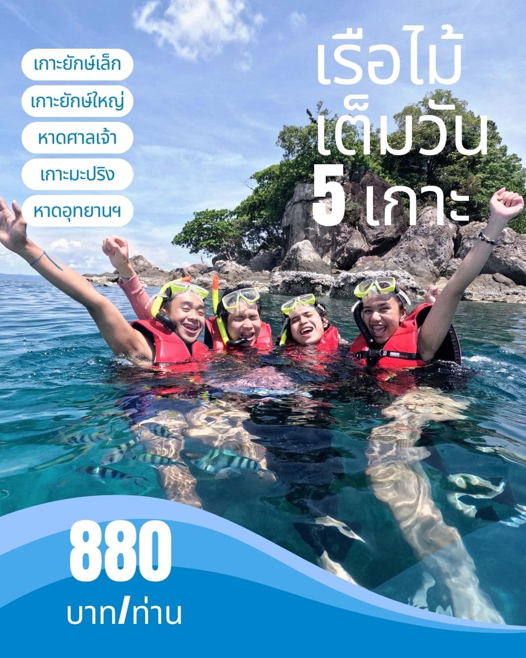 จุดที่ 5 หาดอุทยานฯ โดดน้ำใสๆ เดินเล่นบนทุ่นลอยที่ต่อเป็นสะพานทอดยาวเพื่อเดินขึ้นไปบนชายหาดได้ และสามารถเดินชมฝูงปลาในทะเลได้อย่างใกล้ชิด เมื่อขึ้นจากเกาะรับอาหารว่างยามบ่าย และเดินทางกลับ
